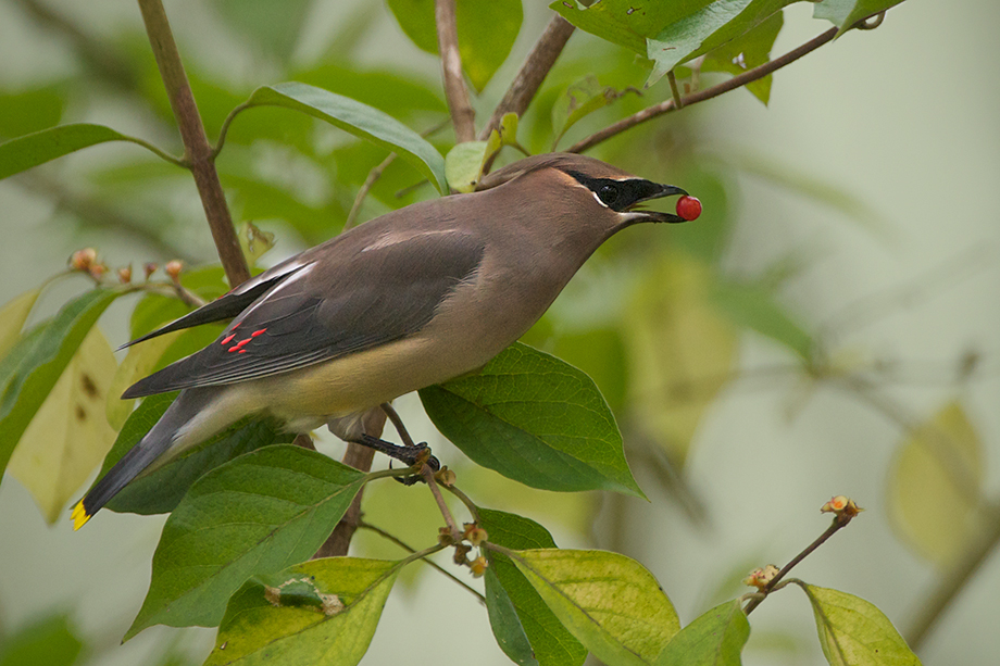 The cedar waxwing is one of those birds that for whatever reason, has eluded me up to this point. While visiting the Cuyahoga National Park last weekend, however, I saw a whole flock of them. This guy grabbed a few quick berries before flying away. Note the red and yellow markings on the bird’s tail feathers.