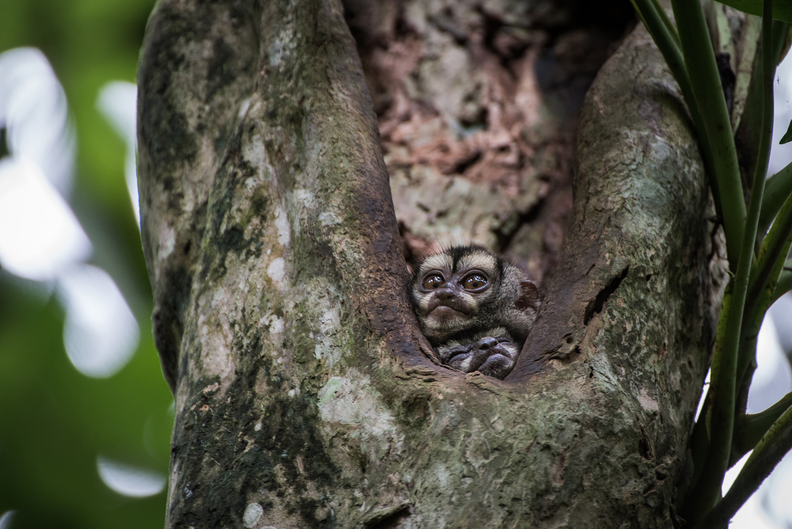 Night monkeys are the only nocturnal monkeys found in the Americas. There are several distinct species, including these two little guys which go by either the Chocoan night monkey or the Panamanian night monkey. I took this photo just before sunset, at about that time that they wearily start to peak out of the tree hollows of their daytime resting spots. You can see the second face, still sleeping, below the top monkey. This one is from Soberania National Park, not far from Panama City. Due to the quickly fading light, I had to use a very slow shutter speed to dig detail out of the shadows. Nikon D810 with Nikkor 200-400mm lens (with 2x teleconverter for 800mm) ISO 800, f/8 at 1/13th of a second