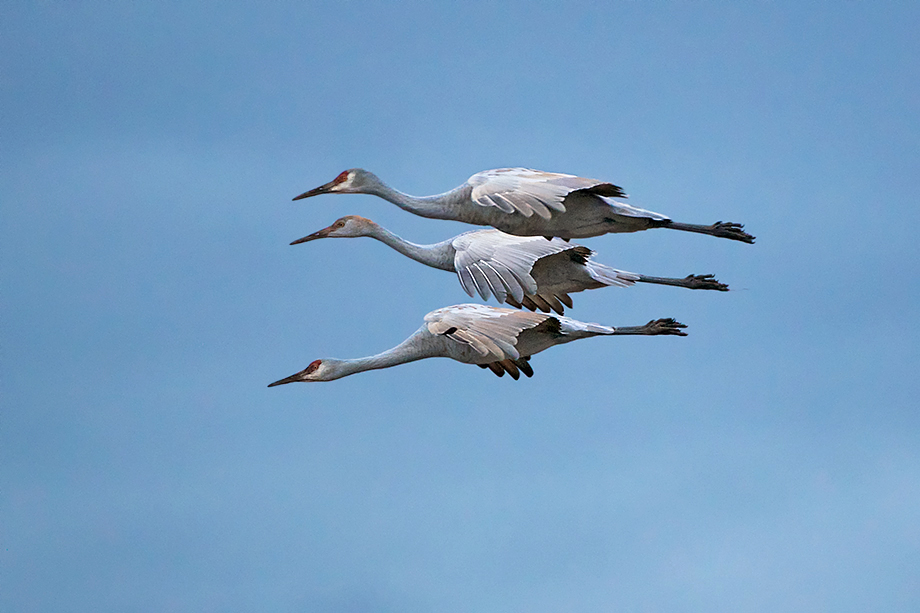 It’s sandhill crane time once again in Bosque Del Apache in New Mexico. This time of year, thousands of these large birds congregate near Socorro in the central part of the state. I took this shot of three of them coming in for a synchronized landing, a few years ago, just after the annual Festival of the Cranes. Nikon D300 with Nikkor 200-400mm lens (at 400mm) ISO 1600, f/4 at 1/400th of a second