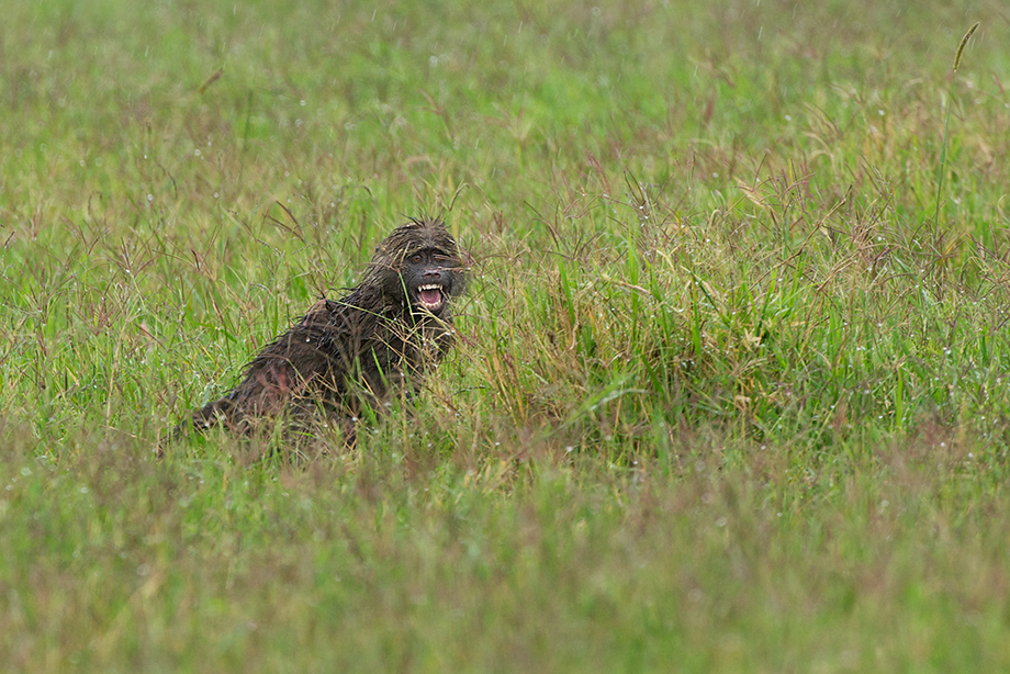 This little baboon was making all sorts of faces and seemed to be having a great time playing in the rain and jumping around in the wet grass on the Laikipia Plains of Kenya. Nikon D300 with Nikkor 200-400mm lens (at 400mm) ISO 800, f/5.6 at 1/500th of a second