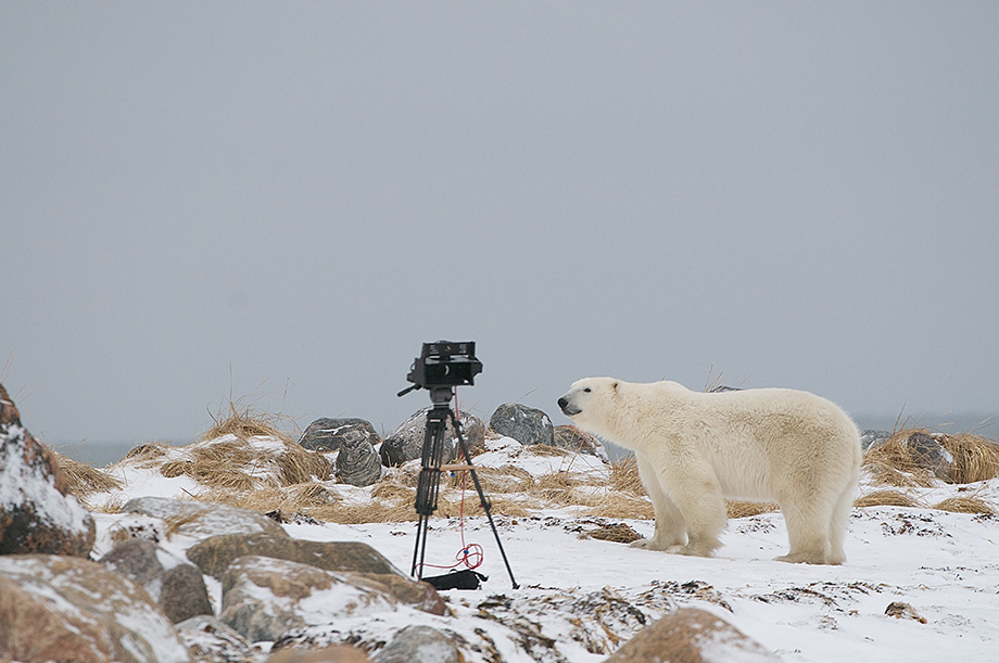 When I was in Manitoba to photograph the polar bears there was a small film crew there working on a 3D movie of the bears. This camera was set up to record time lapse panoramas of the tide rising and falling on the Hudson Bay. The camera guys were getting a little nervous that the bear might make lunch out of their expensive gear. In this instance, the bear just examined the camera for a few seconds before moving on. A few days earlier, however, a healthy chunk was taken out of one of their tripods.