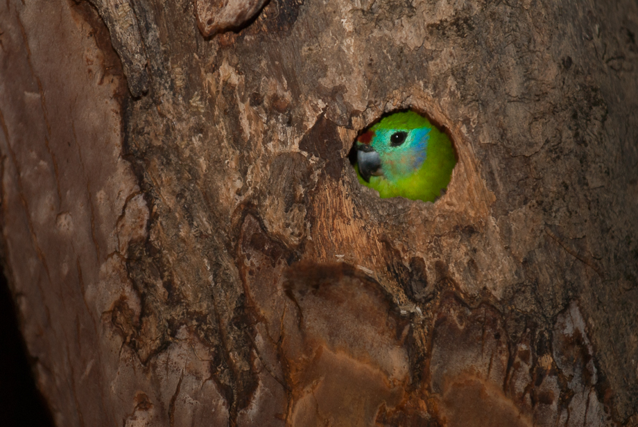 I was on a boat, floating down a river at night, when I met this double-eyed fig parrot in Daintree National Park in Queensland, Australia. This is one of those birds that gets quite a few names. In addition to double-eyed fig parrot, they also go by blue-faced fig parrot, red-faced fig parrot, dwarf fig parrot, and two-eyed fig parrot. Unlike most other parrots which use existing tree-cavities to nest in, double-eyed fig parrots excavate their own, usually in rotting trees. Nikon D200 with Nikkor 80-200mm lens (at 200mm) ISO 200, f/2.8 at 1/60th of a second, two Nikon SB-800 flash units