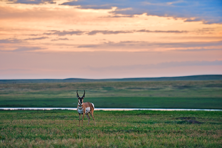 The cheetah may be the fastest land mammal on earth, but when it comes to long range speed, it can’t touch the pronghorn (up to 55 miles per hour for five miles). The pronghorn ranges across a large area of western North America, along the front range of the Rockies. This one, photographed in Badlands National Park in South Dakota, wasn’t exactly showing off its stellar speed, but it cooperated by posing in front of the colorful early morning sky. Nikon D700 with Nikkor 70-200mm lens (at 200mm) ISO 800, f/4 at 1/125th of a second, graduated neutral density filter