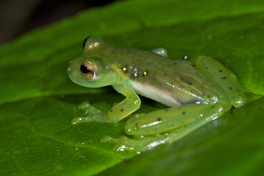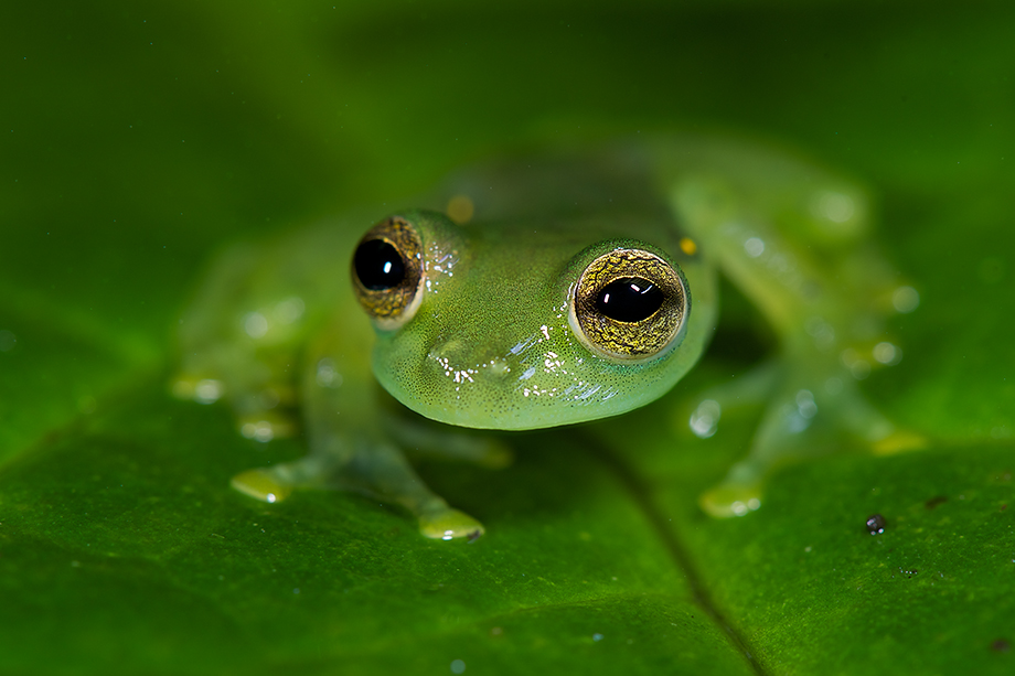 This guy is one of the many species of glass frog that can be found in the tropical rain forests of Central and South America. This particular species of the emerald glass frog is native to Ecuador. They are called glass frogs because the skin on their underside is translucent and you can see straight through to their inner organs, including the heart, liver and gastrointestinal tract. Obviously, I wasn’t going to flip the little guy over, but you can sort of see the translucent skin on the second of the three shots down where the torso meets the leg. Nikon D800 camera with Nikkor 105mm f/2.8 lens, ISO 200, f/10 (first shot), f/14 (second and third shots), 1/60th of a second with two SB-R200 wireless flash heads attached to the front of the lens