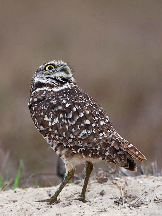 This burrowing owl was displaying the ability to turn its head 180 degrees, keeping an eye on a possible predator flying above (probably an eagle or a hawk). I took this one down in Cape Coral, Florida — one of the best places in the country to see burrowing owls. Nikon D300 with Nikkor 200-400mm lens (at 350mm) ISO 800, f/4.5 at 1/200th of a second