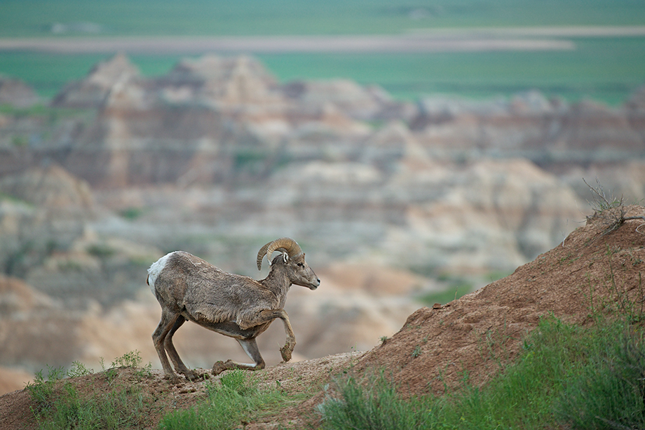 This bighorn seemed to be paying his respects to the powers that be. He was actually just getting up after a lengthy rest. In the background you can see the characteristic eroded buttes of Badlands National Park. Nikon D800 with Nikkor 200-400mm lens (at 400mm) ISO 800, f/4 at 1/500th of a second