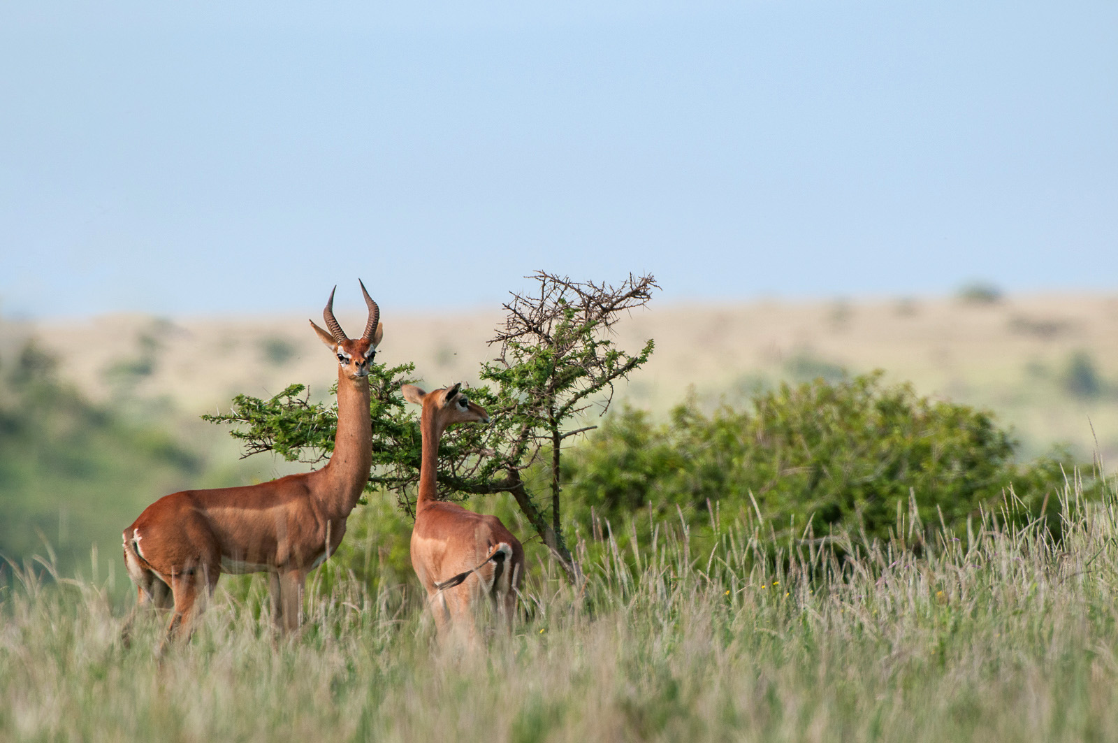 The gerenuk is sometimes called the giraffe gazelle. You can see why with that elongated neck. And as if the neck isn’t enough, the gerenuk regularly stands on its hind legs to reach even higher for food — usually the leaves of acacia trees. I photographed this male and female pair in Lewa Wildlife Conservancy in Kenya. Nikon D300 with Nikkor 200-400mm lens (with 1.4 teleconverter for 550mm) ISO 400, f/6.3 at 1/800th of a second.