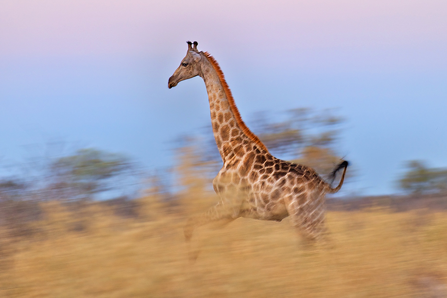 It was late in the day when I captured this photo of a giraffe running across the savanna in Botswana. Panning my camera with the giraffe while using a slower shutter speed created the nice motion blurred effect of the landscape. Seeing giraffes run is always one of my favorite things to watch while on safari — both awkward and graceful at the same time. It almost appears as if they are running in slow motion. Nikon D700 with Nikkor 70-200mm lens (at 200mm) ISO 400, f/5.6 at 1/30th of a second