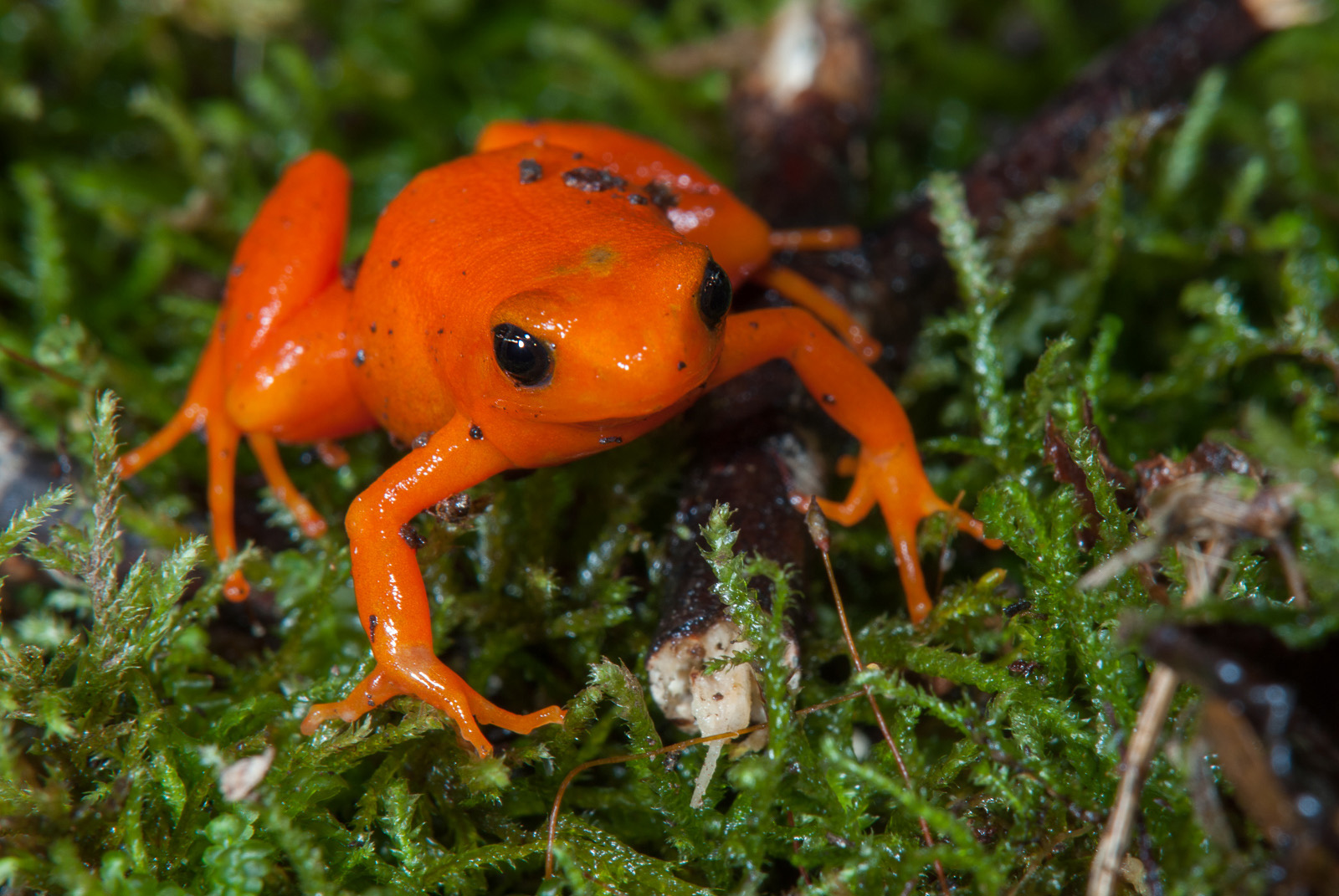 This is a very rare frog that I photographed at the Peyrieras Reptile Reserve in central Madagascar. It is highly endangered due to its very limited distribution and the pressures put on the small areas that it does exist. It is also threatened by over collection by the pet trade. The brilliant color of the golden mantella is thought to be a form of aposematism — which is basically the reverse of camouflage. The bright color is a warning to would-be predators to stay away because the frog is highly toxic. Nikon D200 with Nikkor 80-200mm lens (with Canon 500D close up filter) ISO 100, f/22 at 1/60th of a second, two Nikon SB-600 flash units