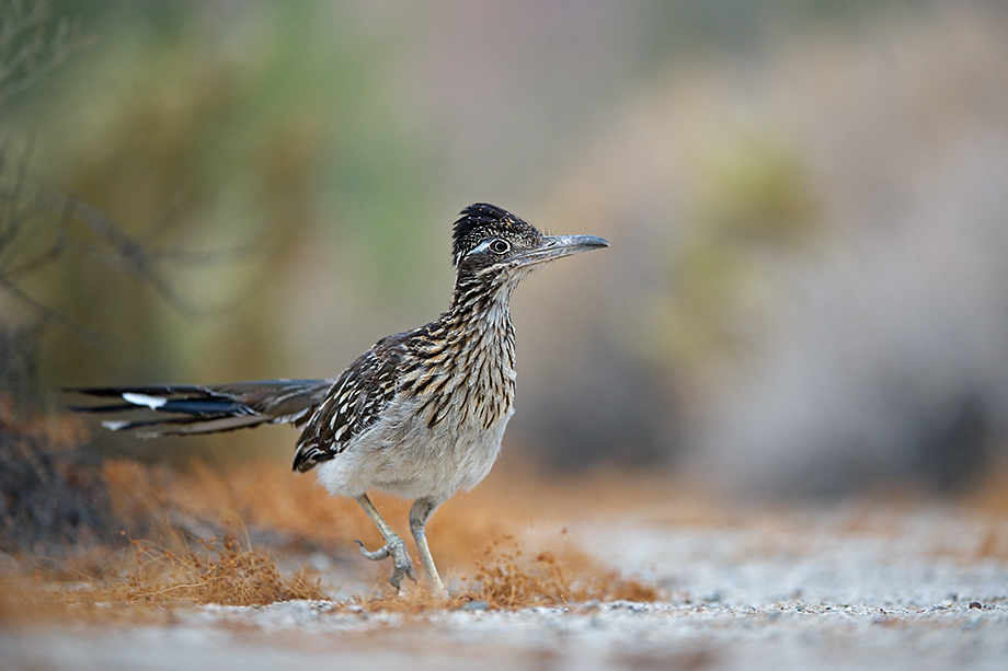 In addition to jackrabbits, I also photographed roadrunners last weekend in Anza-Borrego Desert State Park. I was able to get my camera onto the ground for this one as the roadrunner ran across the desert floor in search of a meal. By getting the camera low, not only was I able to get a much more pleasing perspective of the bird, I was also able to bring out the blurred pastel colors of the desert. Like the jackrabbit yesterday, roadrunners seem to have a special charm, perhaps born of their harsh existence in the desert. They are also known as the chaparral cock, ground cuckoo, and snake killer. I kind of like that last one. Nikon D800 with Nikkor 200-400mm lens (at 270mm) ISO 800, f/4 at 1/640th of a second