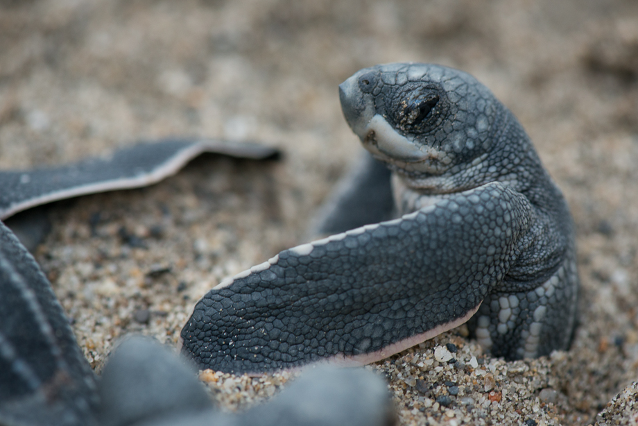 It really is something to see hundreds of little turtles crawling out of the sand. This poor little hatchling appeared to get stuck halfway there and was appealing to nearby siblings for a hand. It took a while, but eventually, he/she was one of the last to struggle to the surface and begin the journey home. The gender of leatherback hatchlings is determined by the temperature of the sand during incubation. Warmer sand temperatures produce more or all female hatchlings, and cooler sand temperatures produce more or all males. Nikon D800 with Nikkor 105mm macro lens, ISO 800, f/5 at 1/80th of a second