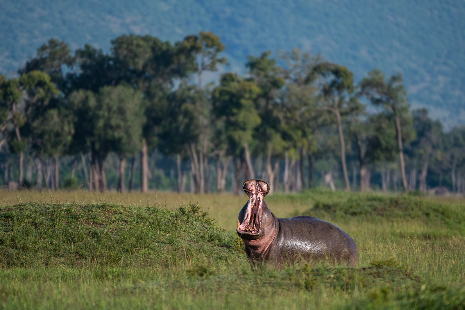 I look for two things when photographing hippos — being out of the water and having the mouth open. This guy granted me both as we drove past. Although it looks as if he might have been reacting to us, he was simply letting out a good yawn. Photographed in the Maasai Mara National Reserve of Kenya. Nikon D500 with Nikkor 200-400mm lens (at 400mm) ISO 400, f/4 at 1/2000th of a second.