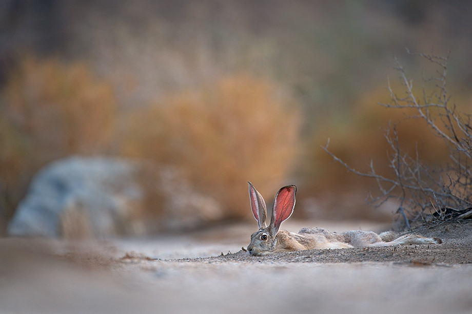 Sprawled face down in the sand, this black tailed jackrabbit seemed exhausted by the desert heat — which, as I mentioned in a post last week, reached 122 degrees. Those long ears, in fact, are an adaptation to the extreme conditions of the desert. The large surface area of each ear is loaded with blood vessels that release heat and thereby cool down the core body temperature of the rabbit. I, of course, was also face down in the sand enabling a ground level perspective. My ears, however, had little effect on my core body temperture. Nikon D800 with Nikkor 200-400mm lens (at 400mm) ISO 800, f/4 at 1/100th of a second