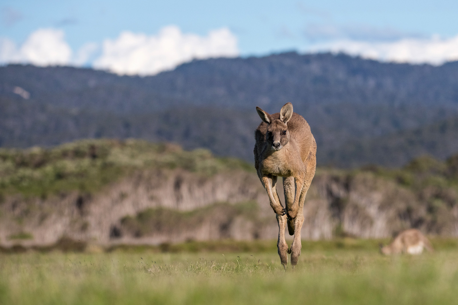 Kangaroos jump. It’s what they do. So here are two shots of eastern grey (locally known as the forester) kangaroos doing just that. One going parallel and one coming right at me. Both were taken in Narawntapu National Park in Tasmania. Top Photo — Nikon D810 with Nikkor 200-400mm lens (at 350mm) ISO 400, f/5 at 1/1000th of a second