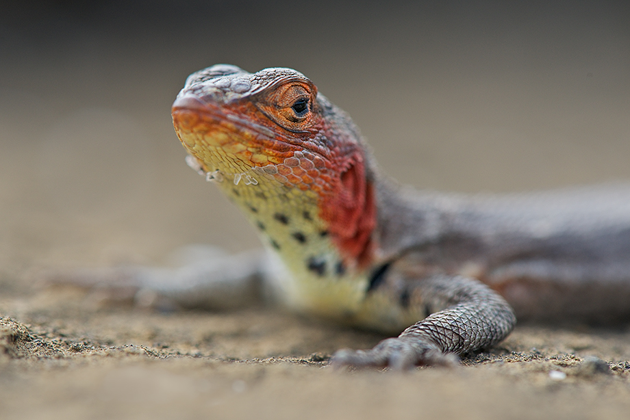 This lava lizard was in the process of shedding its skin, face first. Each island in the Galapagos has a slightly different version of the lava lizard, with slightly different skin colors to match the general environment of the given island. Nikon D800 with Nikkor 105mm macro lens, ISO 400, f/8 at 1/400th of a second