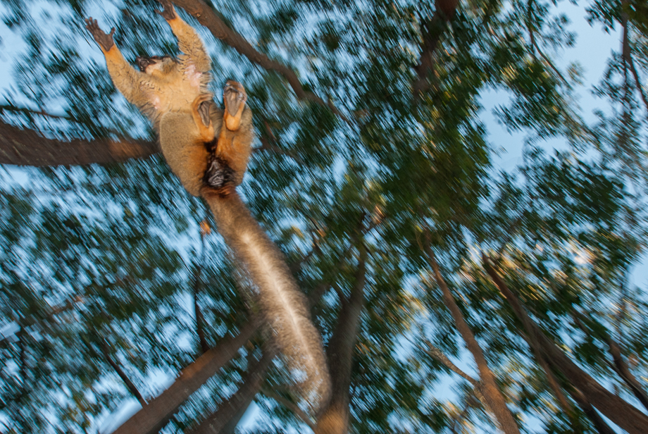 I was directly under this lemur when it jumped from one tree to another. This species is the rather pedestrian named, common brown lemur. They were very habituated to people at this particular location and were jumping all around me. I used a flash to illuminate the under side of the lemur while still exposing for the much brighter sky in the background. Nikon D200 with Nikkor 17-35mm lens (at 17mm) ISO 400, f/5.6 at 1/100th of a second