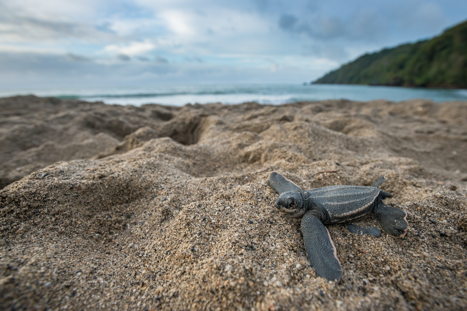 A leatherback hatchling — just hatched — gets its bearings before making the arduous dash to the sea. Photographed in Grande Riviere on the island of Trinidad. Nikon D800 with Nikkor 17-35mm lens (at 17mm) ISO 800, f/5 at 1/640th of a second.