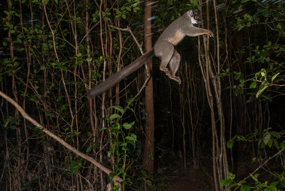 One thing about lemurs — they can really jump. This is a common brown lemur that I photographed in the town of Perinet in Madagascar. I was using my usual two-flash set up on a bracket, only this time with my wide angle zoom. The lemurs were very habituated so I could get really close. Nikon D200 with Nikkor 17-35mm lens (at 20mm) ISO 400, f/5.6 at 1/60th of a second, two Nikon SB-800 flash units