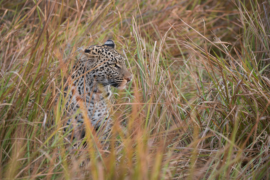 Despite their beautifully colored coats, large cats like leopards, jaguars and tigers all blend in quite nicely with their respective habitats. The alternating dark and light fur provides perfect camouflage amidst the light and shadows of the grasses and shrubs. This particular leopard is the one year old that I posted about a year and a half ago. We came upon a very rare find on safari — a pangolin (see post here for more on that encounter) and I was very excited to get out of the vehicle and down on the ground for some great eye-level action of one of Africa’s most elusive creatures. I couldn’t believe my bad luck when the guide told me that I had to stay in the vehicle — because there was a leopard stalking in the nearby grass. The leopard was right next to our vehicle and I didn’t even see him. How dare he ruin my shot. Of course, I quickly realized that it was actually amazing luck — not only to photograph a pangolin, but one being stalked by a leopard. We stayed there and watched them play their game of cat and mouse (the pangolin, of course, in the unfortunate role of the mouse) until the sun went down.