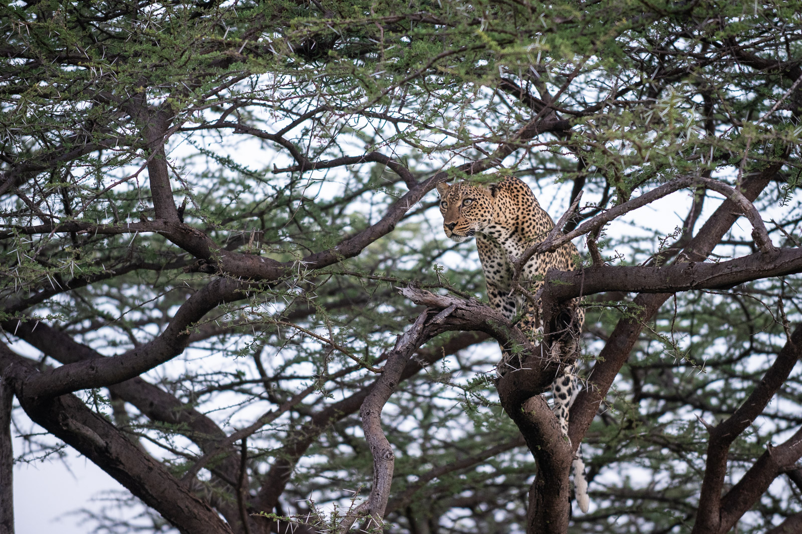 We watched this leopard as she climbed a tree to get a better (more stealthy) look at whatever prey might be out there. She grew very intense, fixing her sight on something that we didn’t see. It quickly got dark so we left her to her hunt. Nikon D850 with Nikkor 70-200mm lens (at 200mm) ISO 1600, f/4 at 1/250th of a second.