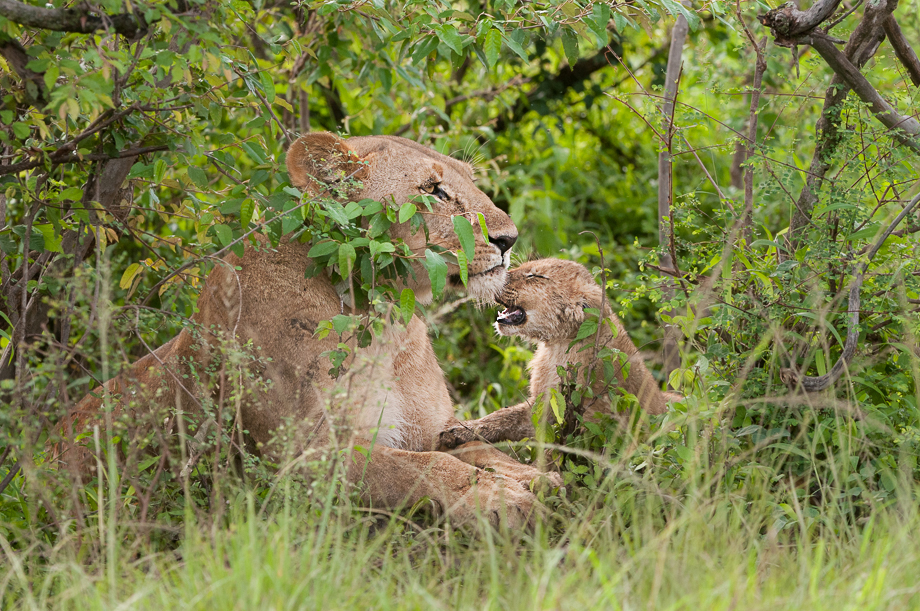 Seemed like a good day for a lion mother and her cub sharing a nice moment in the bushes. I’ve posted other shots of these two lions before. They were separated from the rest of the pride and the mother had just dragged her zebra kill into the bushes. The cub seemed a bit anxious to get back to the rest of the family and kept alternating between rubbing up against mom and coming out into the open to investigate us. Nikon D300 with Nikkor 200-400mm lens (at 250mm) ISO 800, f/5.6 at 1/500th of a second