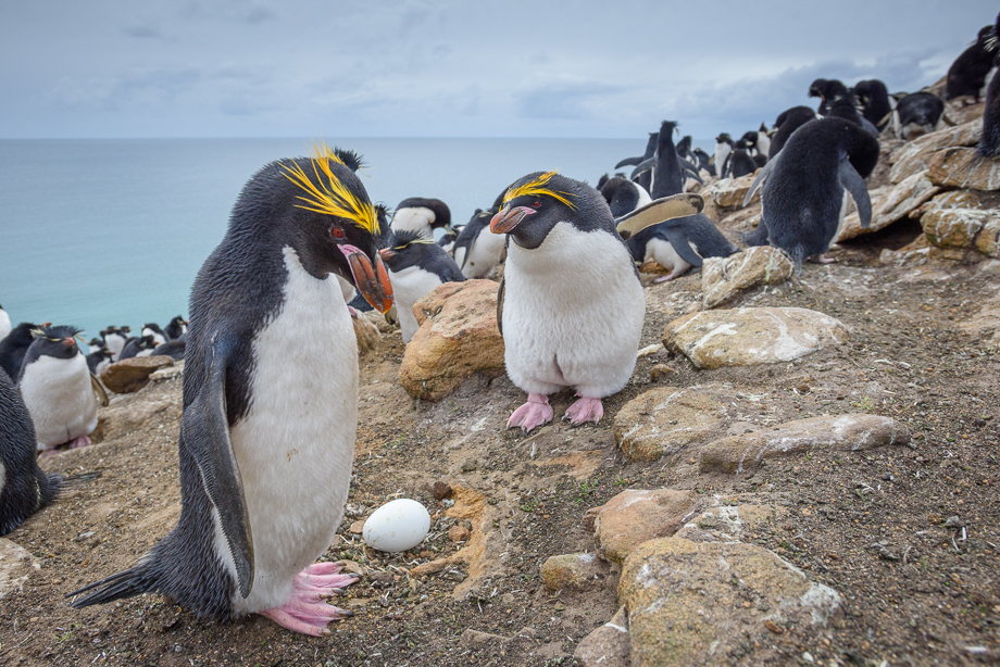 Of the five species of penguin that I photographed in the Falkland Islands, the macaroni was the least common (at least in the Falklands — worldwide they are the most numerous). I only saw a total of three. These two and a single penguin, both caught up in colonies of rockhopper penguins. Luckily, these macaronis were on the edge of the colony so I was able to get pretty close with my wide angle lens. As with most species of penguin, a mating pair shares the duty of sitting on the egg(s). In this shot, it almost looks like the one is ordering the other to get off the egg. They were actually in the middle of a shift change. Nikon D810 with Nikkor 17-35mm lens (at 19mm) ISO 800, f/6.3 at 1/2000th of a second