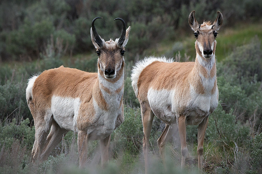 I didn’t see too many pronghorn on this most recent trip to Yellowstone, but there were a few out and about. In this photo, you can see the difference between the male and the female. The males have the prominent pronged horns whereas the females also have horns, but they are much smaller and often times barely visible.