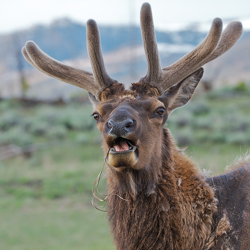 Unlike animals with horns, those with antlers grow and then shed a new set every year. It was the end of May when I photographed this male elk in Yellowstone. His antlers will continue to grow throughout the summer and then in the fall, the velvet skin that you see here will be shed to reveal the hard bone like material underneath. The elk will retain these velvet-less antlers until they are eventually dropped altogether in the winter.