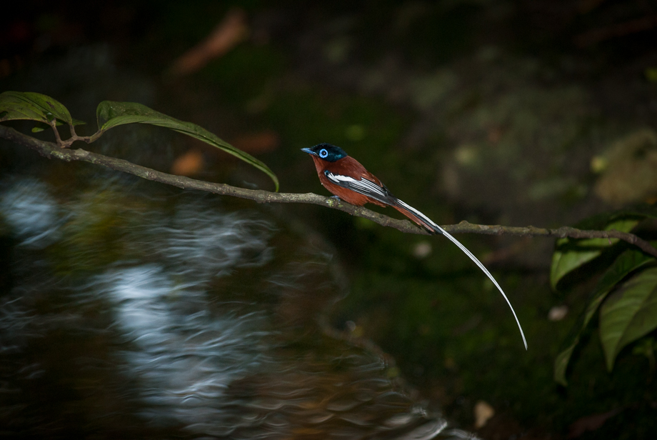 This is a paradise flycatcher. The males of the species have very long tails. As the name suggests, they are insectivorous — mainly catching their prey while in flight. I photographed this one on the island of Nosy Mangabe off the east coast of Madagascar. The background is a bit out of focus and motion blurred, but you can see that the bird is perched on a branch over a small waterfall. Nikon D200 with Nikkor 80-200mm lens (at 185mm) ISO 400, f/2.8 at 1/60th of a second, two SB-800 strobes