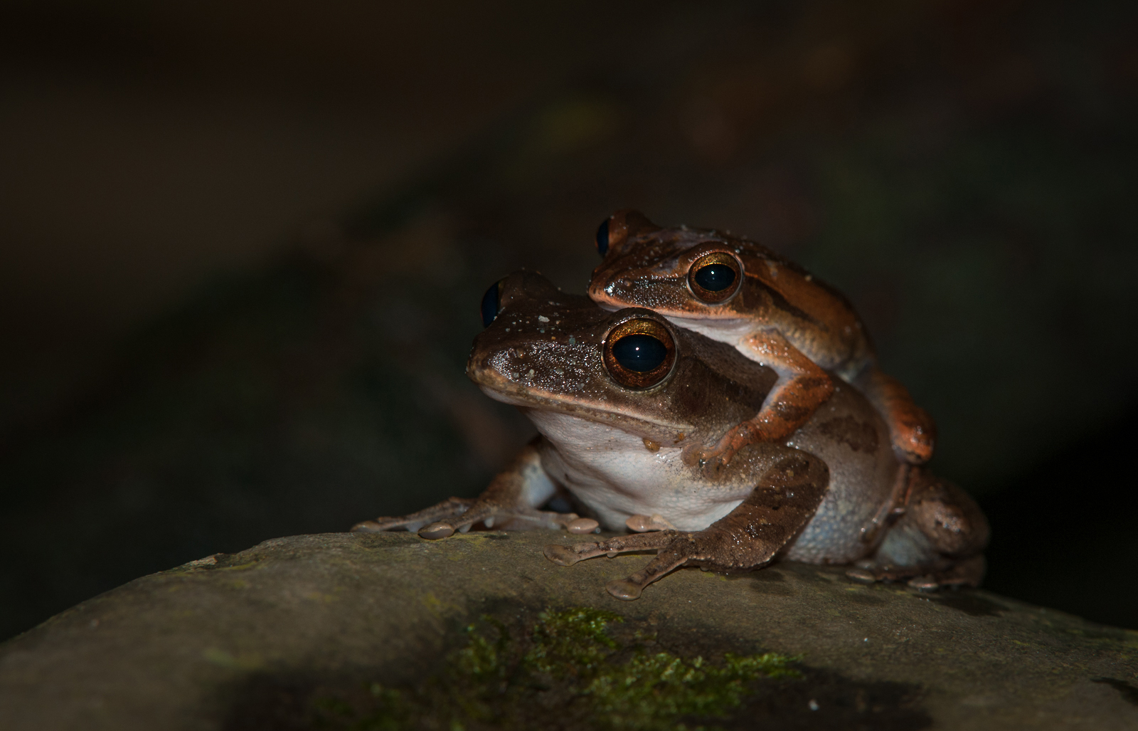 I have no idea what species of frog these two are. What I do know, is that that’s not a baby catching a ride on its mother’s back. I came across the amorous duo on a night hike in Tangkahan, on the island of Sumatra in Indonesia. Nikon D300 with Nikkor 200-400mm lens (at 400mm) ISO 200, f/8 at 1/60th of a second, two Nikon SB-800 flash units
