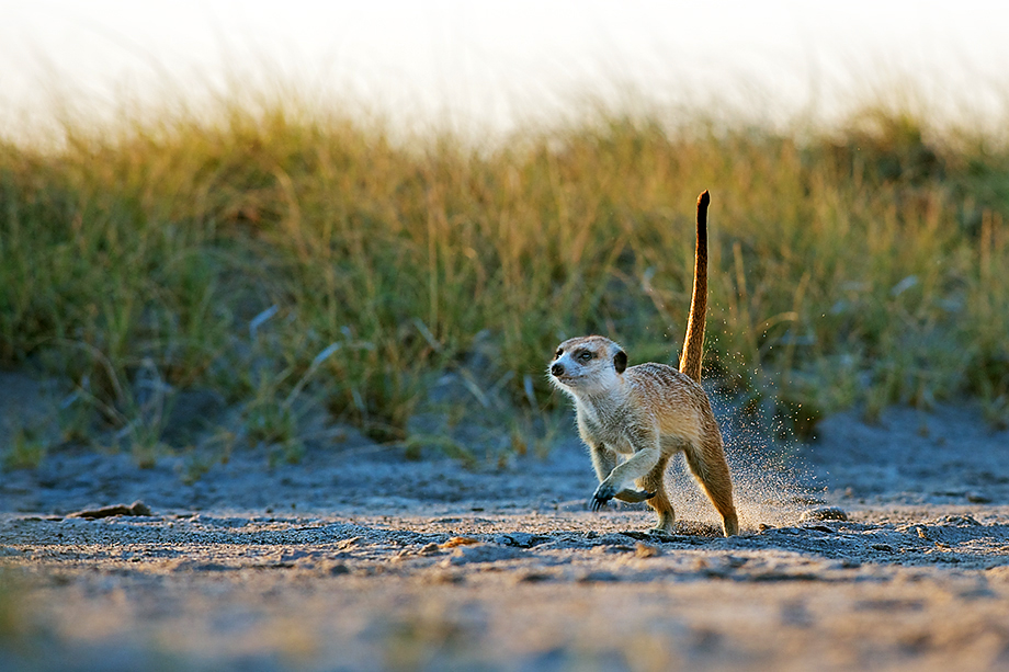 I caught this meerkat late in the day making a dash across a patch of sandy ground. Meerkats are always aware of raptors, jackals and other predators lurking about and they much prefer grassy areas to hide in as opposed to more barren desert. That being said, they’ll risk the exposure to hunt for scorpions, their favorite meal.