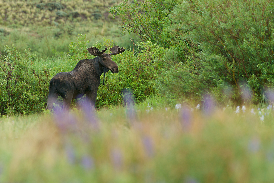 It was early spring when I photographed this bull moose in a field of out-of-focus lupine in northern Colorado. Like all male deer (yes, a moose is a deer) a new set of antlers is grown each year before being shed in the winter. Throughout most of the growing season, the antlers are covered in velvet. Once fully grown, the velvet will shed, and soon thereafter, the antlers will be dropped. This guy is also displaying a nice dewlap — that fancy flap of skin hanging from beneath the chin. Nikon D300 with Nikkor 200-400mm lens (at 340mm) ISO 400, f/5 at 1/500th of a second
