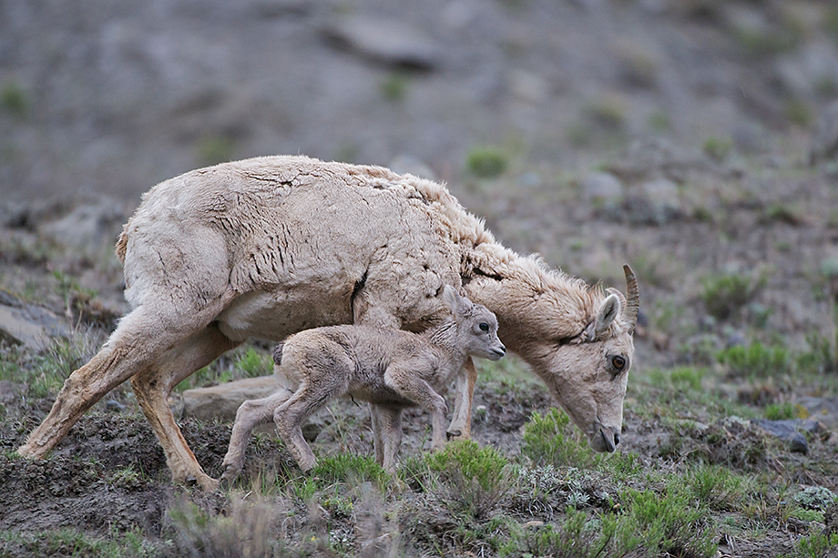 Bighorn lambs can be very fun to watch. This little guy had a friend and the two of them would run up and down the steep cliffs before returning to their mothers. As for the moms, they seemed more interested in chewing grass than in looking after the babies. Nikon D300 with Nikkor 200-400mm lens (at 400mm) ISO 800, f/4 at 1/200th of a second