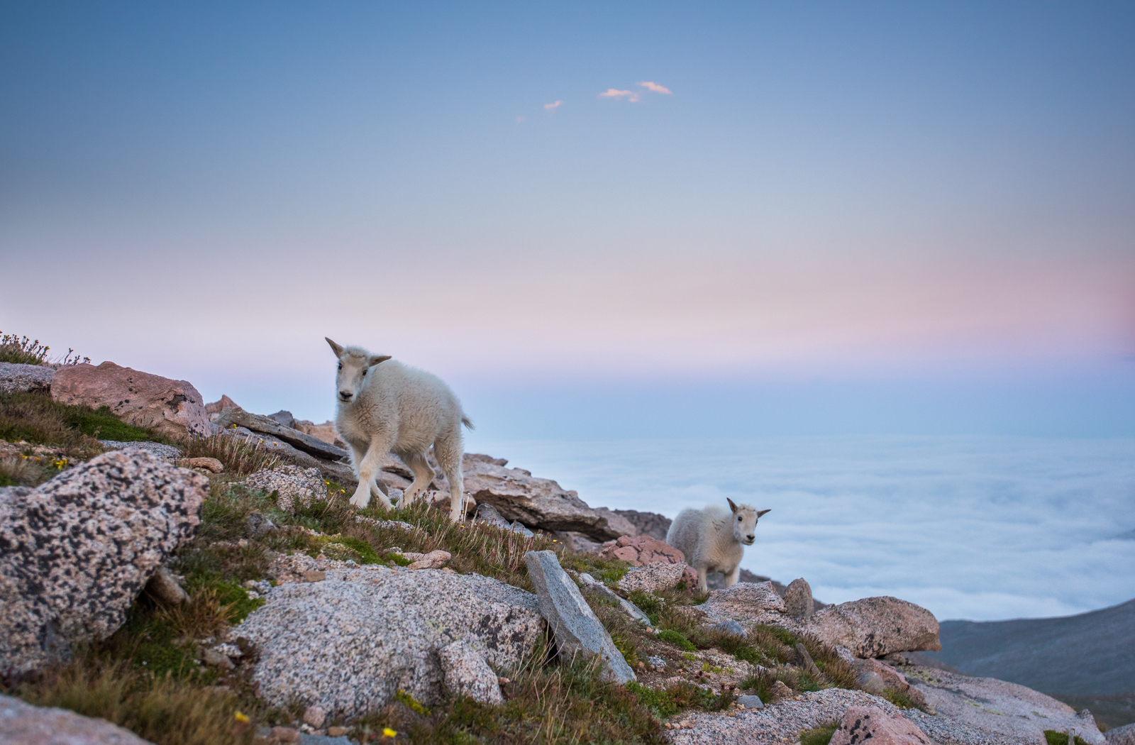 These two mountain goat kids had been playing with each other for quite a while, unmindful of any adult supervision. Eventually, they looked up to see that mom and company had moved further up the mountain. I caught them hurrying to catch up as the sun dipped below the clouds near the top of Mount Evans in Colorado last summer. Nikon D810 with Nikkor 17-35mm lens (at 32mm) ISO 800, f/4 at 1/800th of a second
