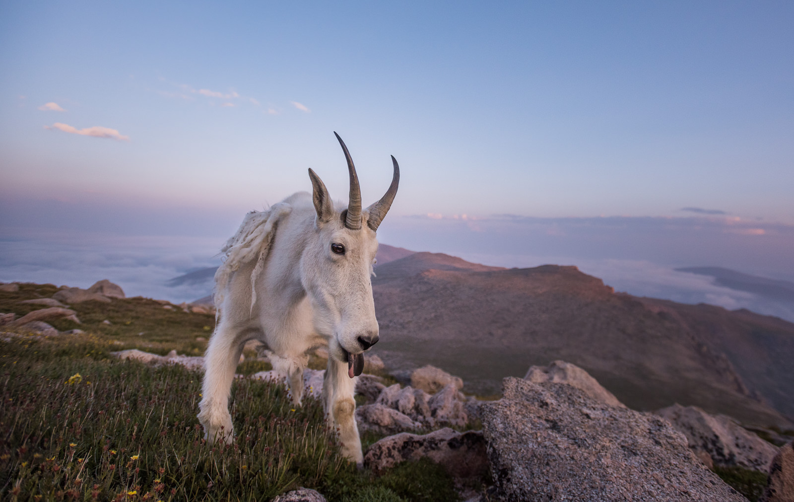 This mountain goat looks a bit spent after climbing to the top of the mountain. All I had to do was drive. Mount Evans in Colorado is the highest paved road in North America, and also happens to be one of the best places in the country to reliably see mountain goats. Nikon D810 with Nikkor 17-35mm lens (at 17mm) ISO 800, f/4 at 1/2500th of a second