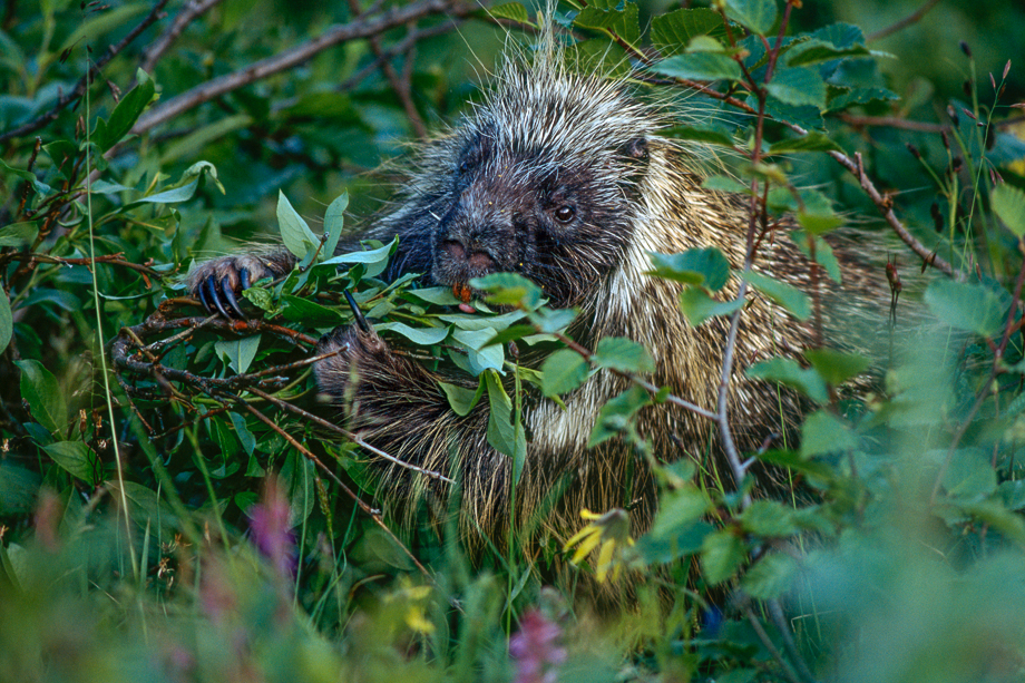 This is an old one from back in 2002 when I was living in my car (by choice) and drove up to Alaska. The great thing about Alaska in July is that nocturnal animals still come out even though the sun never sets. I went for a hike at midnight in Denali National Park and came across this North American porcupine doing his porcupiney thing. You can see those nice big, orange front teeth as the porcupine munches on the vegetation. I was shooting slide film back then and not recording film speed, shutter or aperture data. My camera was a Nikon F100 and the lens was most likely my 80-200mm in the 200mm range.