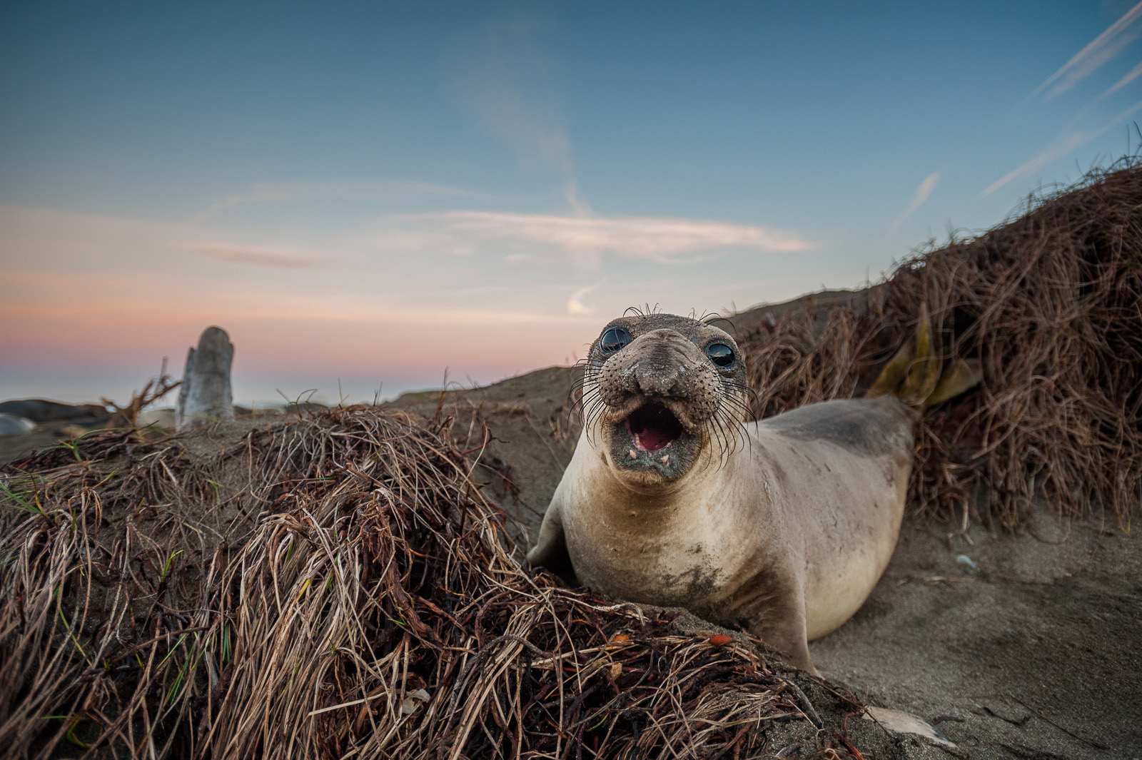 Here’s another one from my favorite elephant seal spot on the central California coast. This is a young one — too old to be with his mother but too young to be out mixing it up with the big bulls. At this age, they tend to hang back in the dunes away from the action. Nikon D700 with Nikkor 17-35mm lens (at 24mm) ISO 1600, f/2.8 at 1/320th of a second.