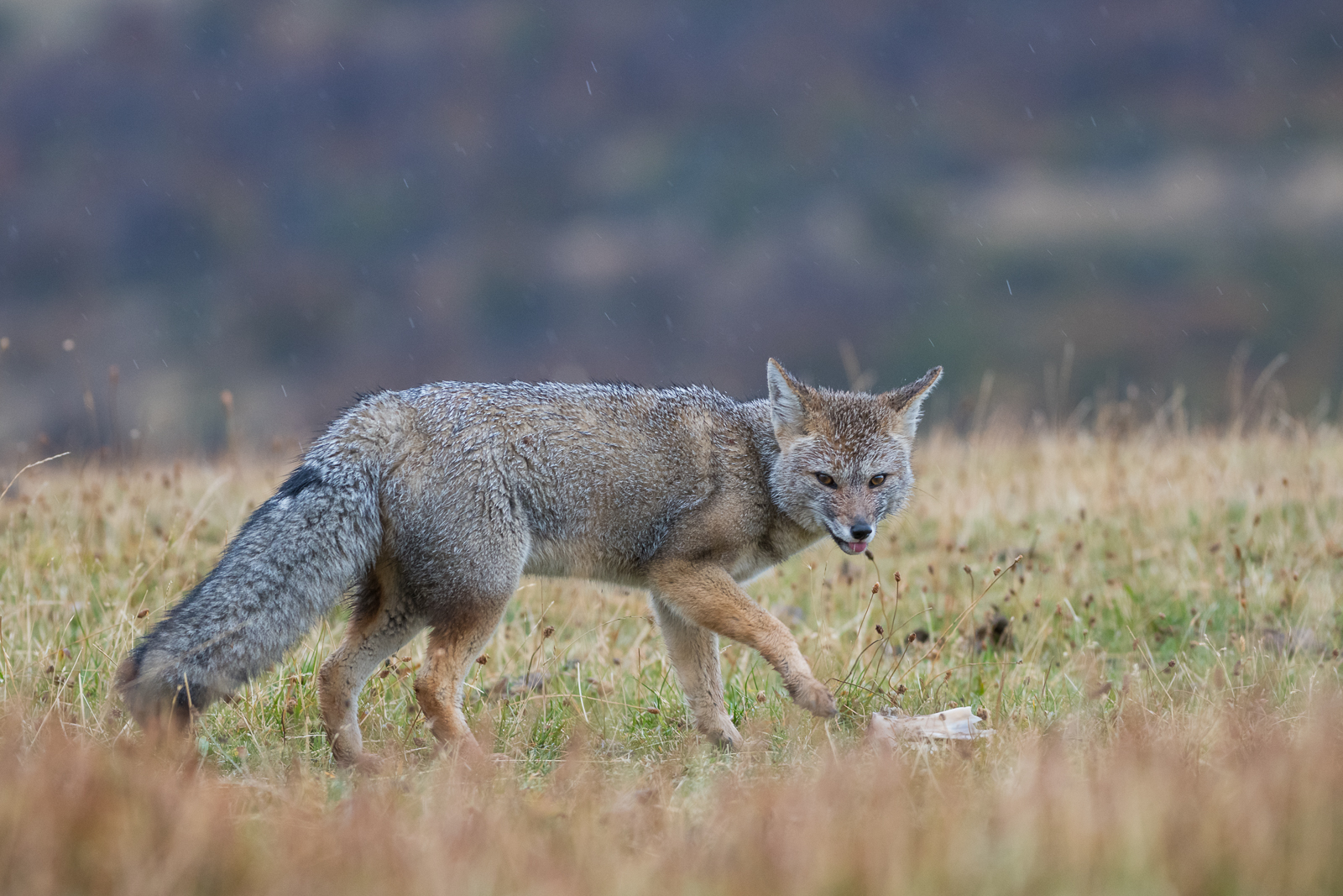 The Patagonian gray fox is a small, agile canid native to the windswept grasslands and shrublands of southern Argentina and Chile. Despite its name, it’s more closely related to wolves and jackals than true foxes, and it’s well-adapted to the harsh, open landscapes of Patagonia. With a bushy tail and a mottled grey/rust coat, it blends easily into its surroundings while hunting for rodents, birds, fruit, and carrion. Curious but cautious, they’re often seen pausing to glance back before disappearing into the wild Patagonian steppe. Nikon D500 with Nikkor 200-400mm lens (at 240mm) ISO 800, f/4 at 1/500th of a second.