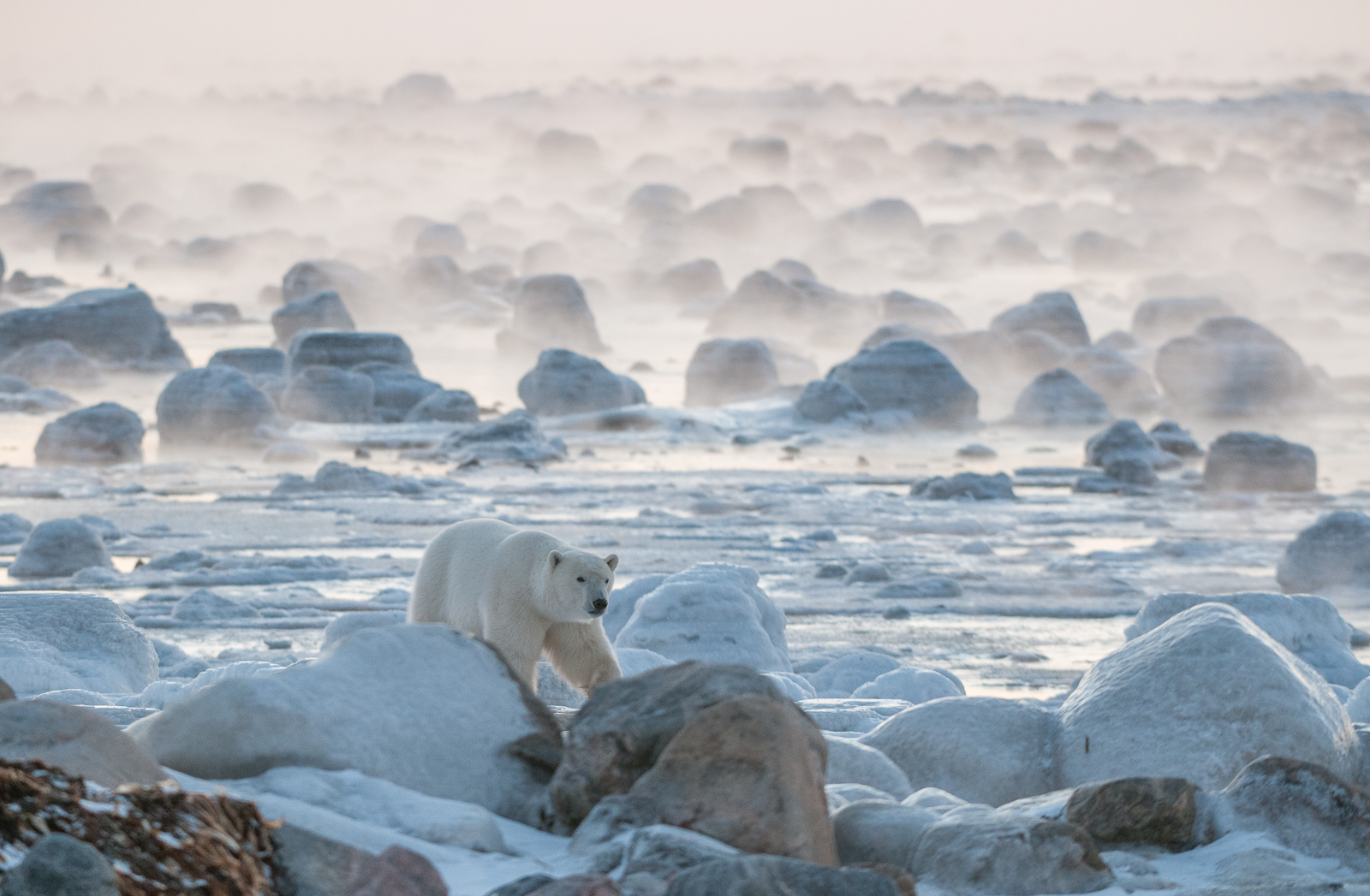 The time to see polar bears in northern Manitoba, Canada is right about now. Between mid October and mid November. That’s when the water freezes on the Hudson Bay and the bears congregate along the shoreline waiting for the ice to be strong enough so that they can go hunt for seals. As the water rises and falls, large boulders of ice form and are left behind. Nikon D300 with Nikkor 200-400mm lens (at 240mm) ISO 800, f/4 at 1/250th of a second