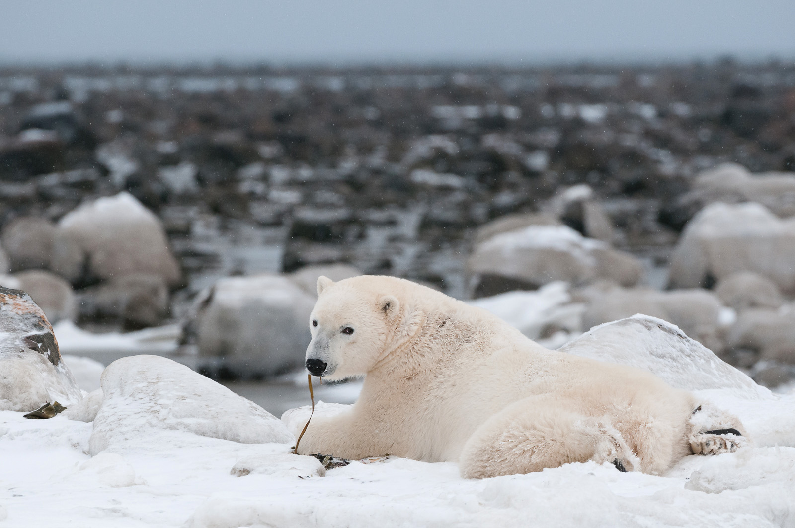 My mother’s dog Rogan (RIP Rogan) used to sit like this and we would call it the frogger position. We like to anthropomorphize animals like that (attribute human characteristics). But since being a dog owner myself, I can’t help also seeing canine features in other animals — be it the face of a seal, the muzzle of a lion, or the resting position of a polar bear. Nikon D300 with Nikkor 200-400mm lens (at 360mm) ISO 800, f/5.6 at 1/320th of a second.