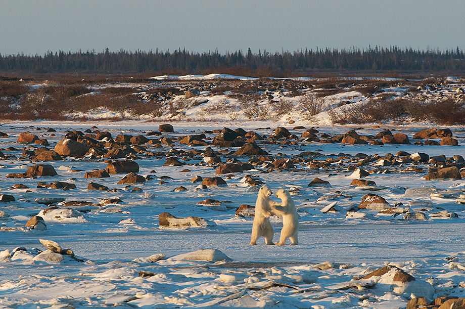 I was just finishing breakfast when I saw these two polar bears through the dining room window of the lodge. I quickly grabbed my equipment and hustled on out to a side patio to record the action. Turns out I could have taken my time as they kept at it for a good 20 minutes or so. They were obviously play fighting on the ice, but at times it really did look like they were out on a giant dance floor.