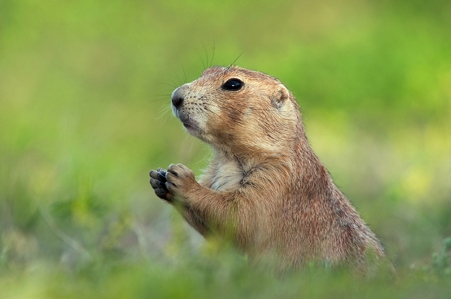 This prairie dog was living in a small town near the base of Devils Tower National Monument in Wyoming (that’s what they call an area of active burrows — a prairie dog “town”). I got down low in order to frame the animal with all that out of focus green grass.