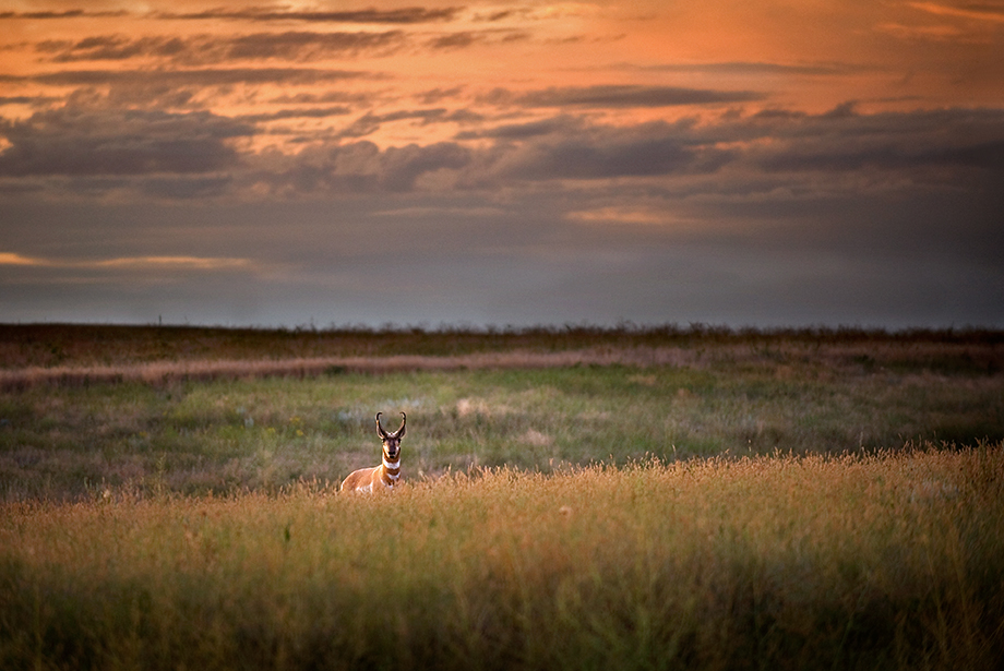 I captured this shot early one morning in Badlands National Park in South Dakota. The pronghorn was standing so still that I was able to take several exposures and then blend them together to hold all the detail in the sky while still exposing for the foreground.