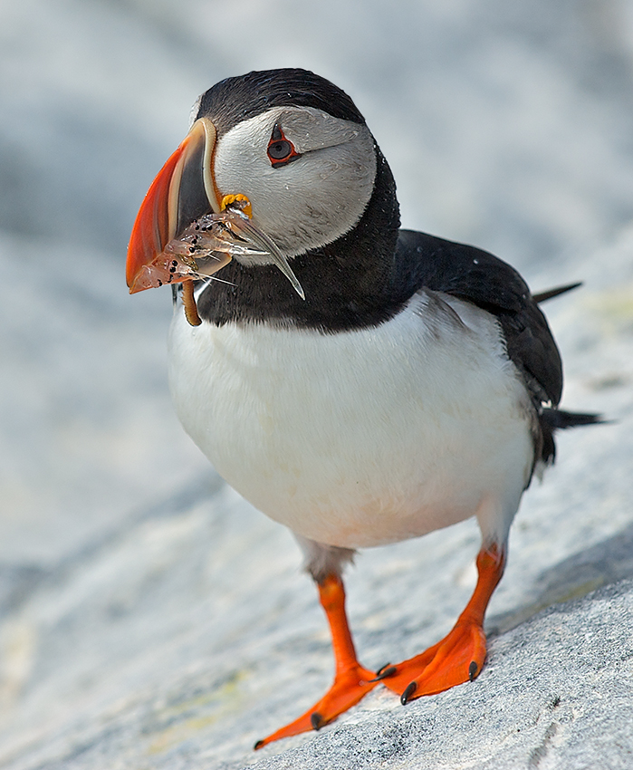 I figured it was about time for a new puffin post. I took this one on my first trip to Machias Seal Island in Maine (or New Brunswick, Canada depending upon who you’re talking to — both the US and Canada claiming ownership of the small island). During the summer months, puffins and razorbills nest on the rocky shoreline. This puffin had a mouth full of krill that she was bringing back to her nesting chicks. Nikon D200 with Nikkor 70-200mm lens (at 200mm) ISO 100, f/5.6 at 1/1000th of a second
