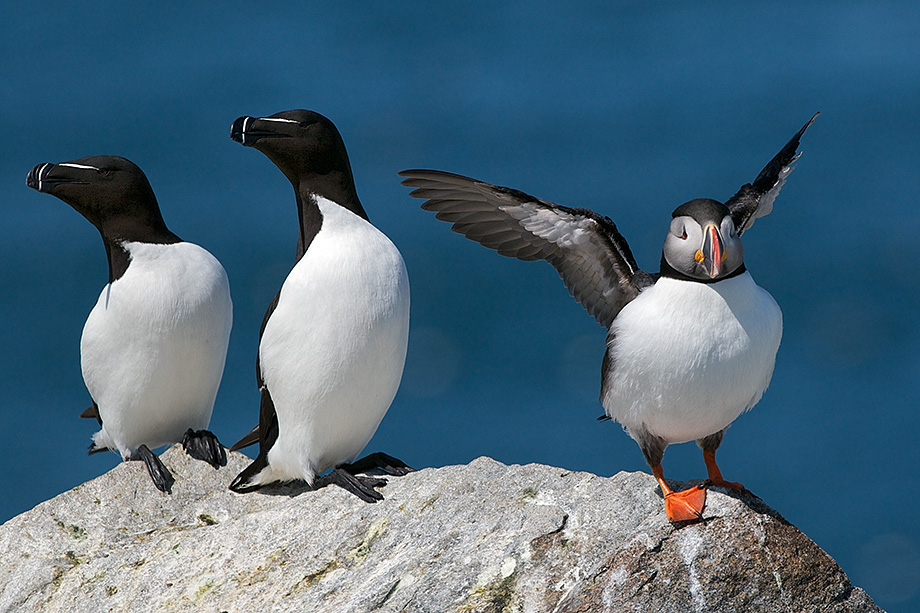 Last time I was on Machias Seal Island off the coast of Maine, there were only a few razorbills and tons of puffins. This time it was completely the opposite. In this particular photo, a couple of those razorbills display their displeasure with the underarm stink of a puffin.