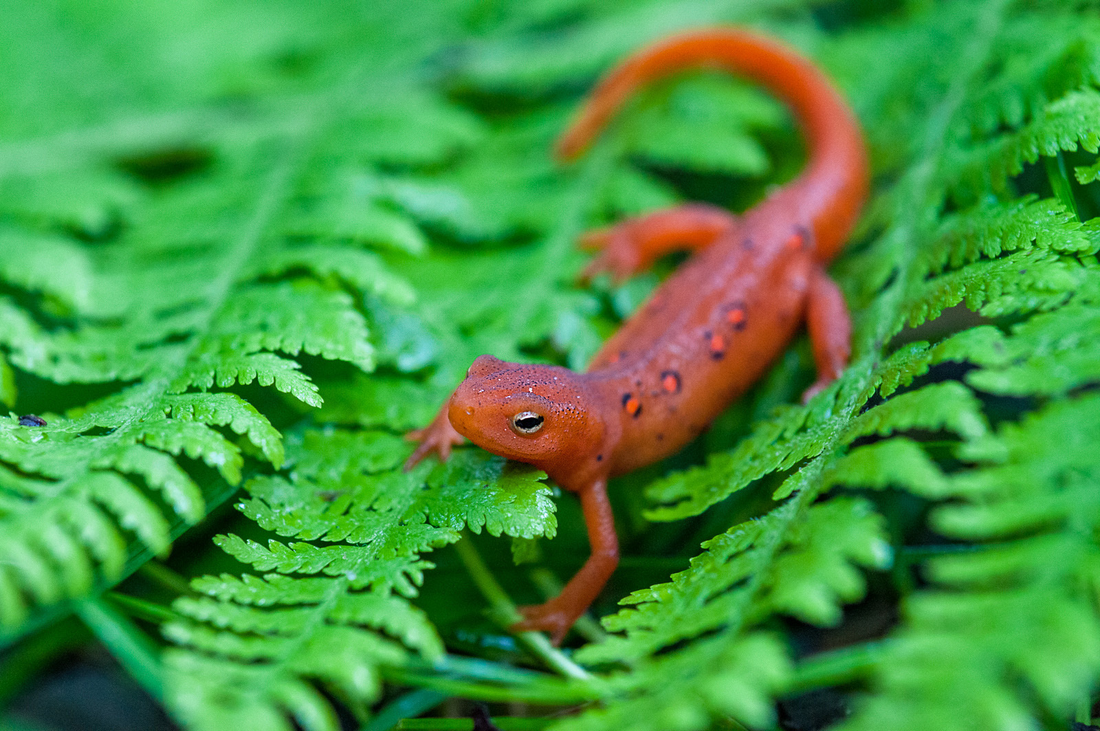 When an eastern newt is in its juvenile phase, it turns a bright orangish red, puts on a nice spotted coat, and spends its time on land. As it grows into the newt it will eventually become, it moves to a more permanent water source in the form of a river, pond or lake. It’s when it’s in this red phase that it is commonly called a red eft. Nikon D300 with Nikkor 70-200mm lens (at 120mm) ISO 800, f/5.6 at 1/20th of a second.
