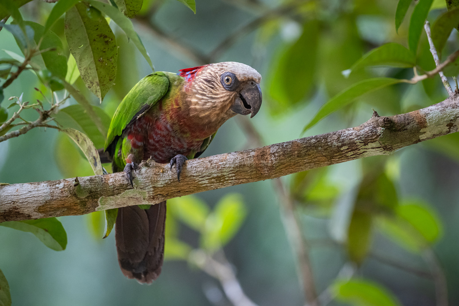 The red fan parrot, also known as the hawk-headed parrot, is one of the most striking parrots of the Amazon Basin, including the forests of Guyana where I captured this one. When excited or threatened, it raises a dramatic fan of red-and-blue neck feathers that spreads around its head like a headdress. This display makes the bird look far larger and more intimidating than it really is. I got a few different shots but the parrot(s) I saw never fully extended those feathers. A great sighting nonetheless.Nikon Z8 with Nikkor 500mm PF lens, ISO 3200, f/5.6 at 1/400th of a second.