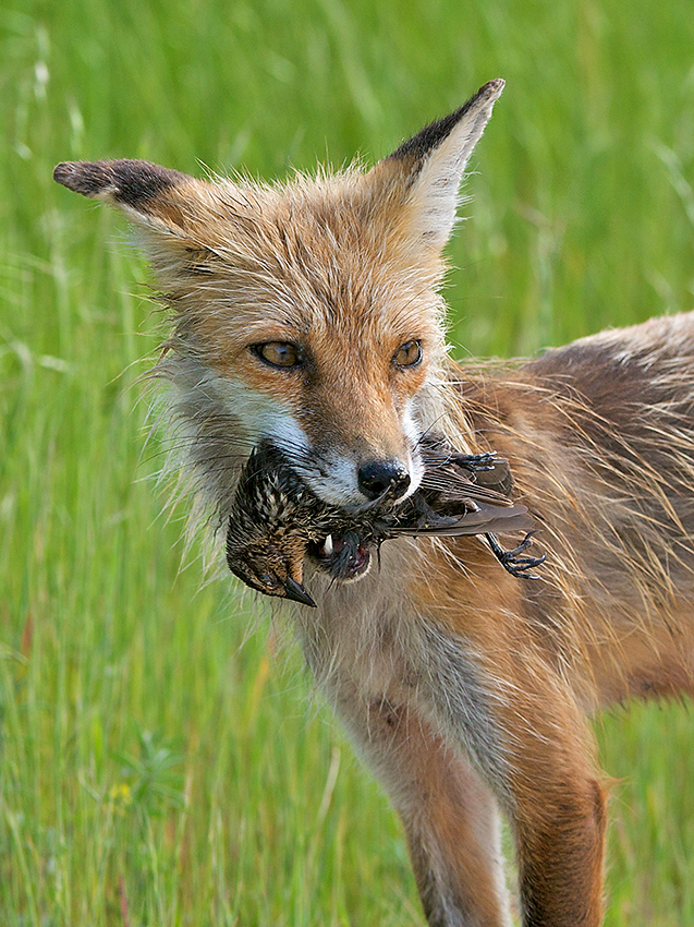 It was early in the morning down at Bombay Hook National Wildlife Refuge in Delaware when I saw this red fox trotting along the side of the road with what appears to be a female red-winged blackbird in its mouth. She was heading back to her den where two pups were waiting for their breakfast. Nikon D300 with Nikkor 200-400mm lens (at 200mm) ISO 400, f/5.6 at 1/640th of a second