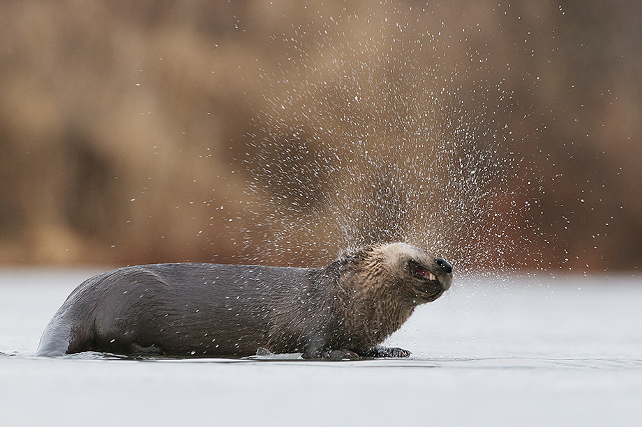 Getting the camera on the ground, or in this case on the ice, always provides a nice perspective, especially for smaller animals. But with these river otters, I was also getting as low as possible in order to get their inevitable shake of the head (and subsequent water spray) against that nice dark background.