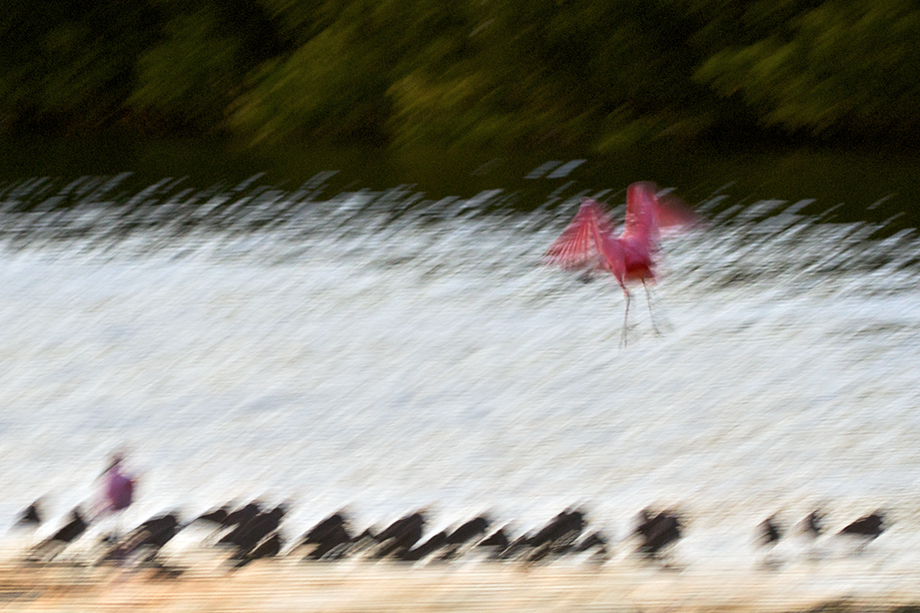 I’m usually all about trying to get precise focus on my animal subjects, but sometimes I go for something a little more abstract. This shot was taken a few years back on Sanibel Island in Florida at the Ding Darling National Wildlife Refuge (strange name, I know, but one of the best places in the country to photograph birds). The sun had completely set and twilight was fading fast. It was too dark to freeze the action of this roseate spoonbill coming in for a landing so I used the slower shutter speed to my advantage and panned my camera and lens downward with the motion of the bird.